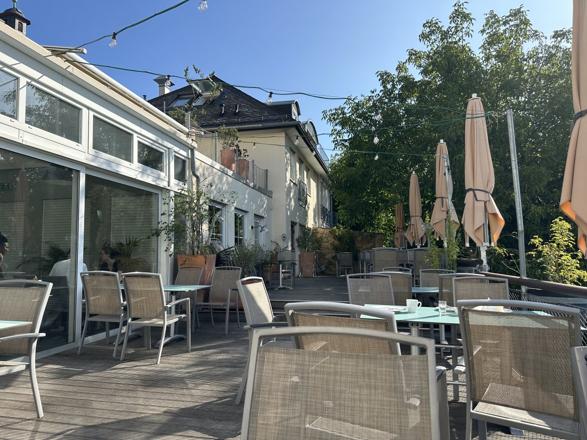 Restaurant with a terrace that offers a magnificent view of the Rhine. Restaurant at the ... Mehr Restaurant with a terrace that offers a magnificent view of the Rhine. Restaurant at the hotel, in the style of an old castle. Everything is very beautiful, authentic. But the prices are too high, a glass of Riesling costs almost 9 euros…