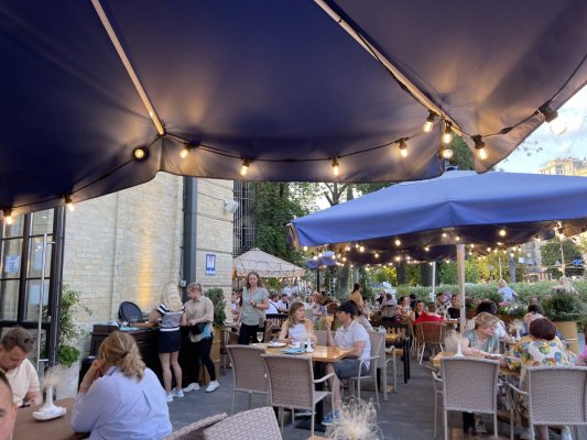 Столик на террасе бронировали заранее, пришли в назначеное время, сделали заказ, который ожидали минут 20.
